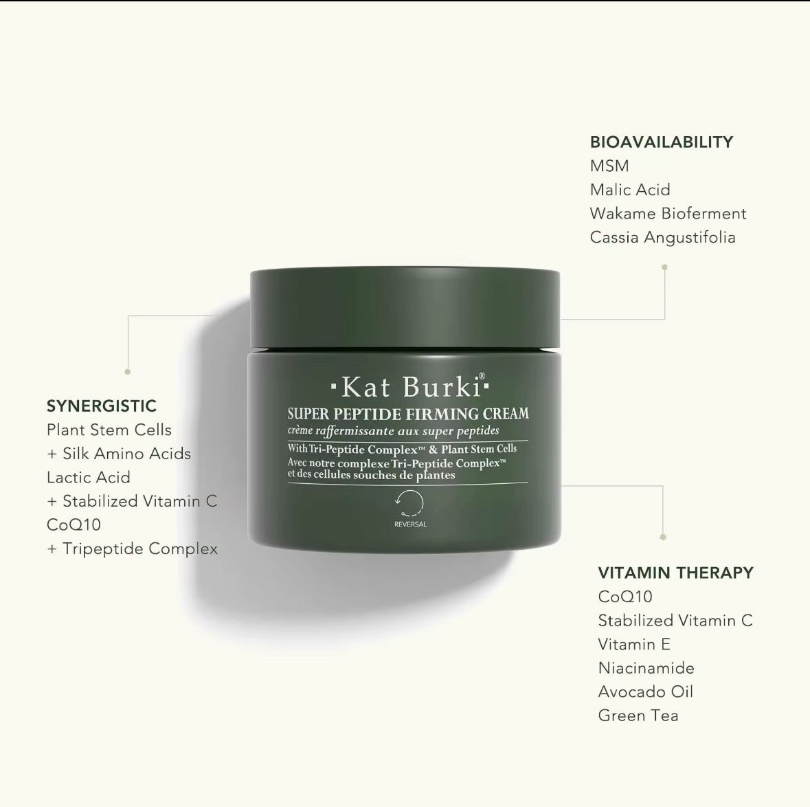 KB5™ Complex (Arnica Montana (Arnica), Centella Asiatica (Gotu Kola), Lavandula Angustifolia (Lavender), Calendula Officinalis (Calendula), Matricaria Recutita (Chamomile)), Aloe Barbadensis Leaf Juice (Aloe), Glycerin, Cetyl Alcohol, Glyceryl Stearate, Isopropyl Palmitate (Palm Oil), Lactic Acid, Squalane, Cetearyl Alcohol, Stearyl Alcohol, Dimethyl Sulfone (MSM), Tocopherol (Vitamin E), Ascorbic Acid, Palmitoyl Tetrapeptide-7, Acetyl Hexapeptide-1, Palmitoyl Tripeptide-1, Palmitoyl Tripeptide-5, Silk Protein Amino Acid Blend (Sodium PCA, Aspartic Acid, Arginine, Glycine, Alanine, Histidine, Proline, Threonine, Phenylalanine, Serine, Isoleucine, Valine), Persea Gratissima Oil (Avocado), Globularia Cordifolia Callus Culture Extract (Plant Stem Cells), Cucumis Sativus Oil (Cucumber Hydrosol), Niacinamide (Vitamin B-3), Undaria Pinnatifida Cell Culture Extract (Wakame Bioferment), Botanical Hyaluronic Acid (Hydrolyzed Caesalpinia Spinosa Gum, Caesalpinia Spinosa Gum), Camellia Sinensis Leaf Extract (Green Tea), Arctostaphylos Uva Ursi Leaf Extract (Bearberry), Ubiquinone (CoQ10), Sclerotium Gum, Sodium Lactate (Lactic Acid), Sodium Malate (Malic Acid), Lysolecithin, Lecithin, Phytic Acid, Pullulan, Cymbopogon Schoenanthus Oil (Lemongrass), Pyrus Malus Fruit Extract (Apple), Lonicera Caprifolium Flower Extract (Honeysuckle), Lonicera Japonica Flower Extract (Japanese Honeysuckle), Saccharum Officinarum Extract (Sugar Cane), Citrus Aurantium Dulcis Fruit Extract (Petite Grain), Citrus Limon Peel Extract (Lemon), Tetrasodium Glutamate Diacetate, Dipeptide Diaminobutyroyl Benzylamide Diacetate, Cetearyl Glucoside, Xanthan Gum, Potassium Sorbate (Preservative, less than 1%), Sodium Benzoate (Preservative, less than 1%), Sodium Hydroxide, Natural Fragrance, Citronellol, Geraniol, Limonene.